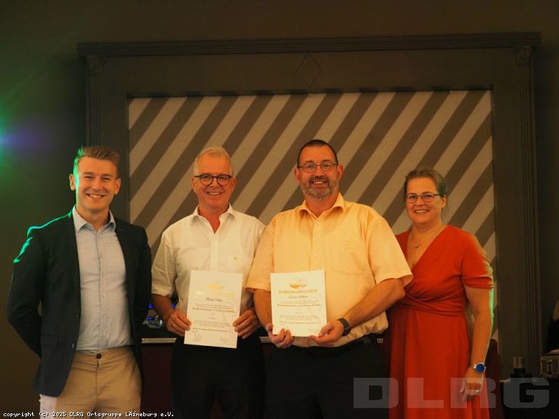 In diesem Rahmen haben Michael Düker und Carsten Goldbach das Verdienstzeichen Gold mit Brillant für ihre langjährige Arbeit in der DLRG verliehen bekommen.